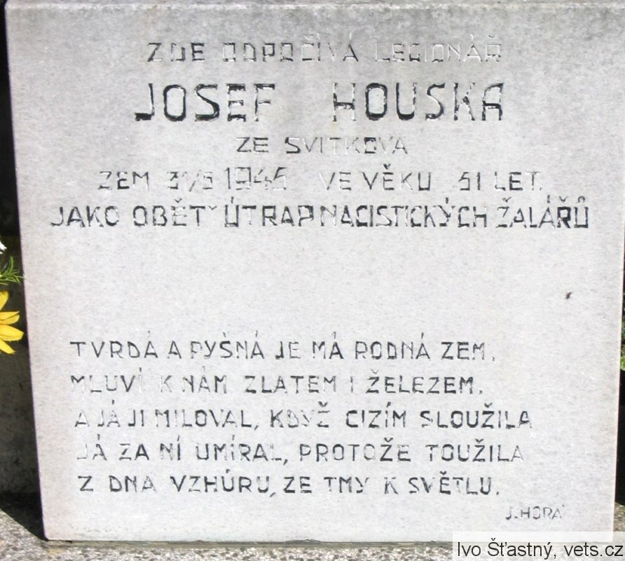 Houska Josef, nar. 13.12.1894, Máteřov. V RU armádě sloužil u 30. pěšího pluku, resp. 2. zeměbraneckého pěšího pluku jako vojín. Zajat 9.10.1916, Gariolla, Tyroly. Do ČS legií v Itálii se přihlásil 9.4.1917, Padula. Zařazen 1.4.1918 jako vojín k 31. pěšímu pluku. Demobilizován 31.12.1919 jako vojín 39. pěšího pluku. (zdroj databáze VÚA Praha)
