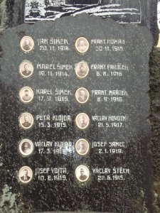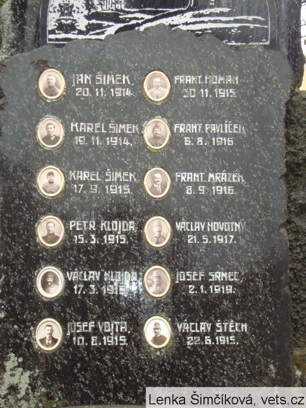 Jan Šimek 20.11.1914 ( u Lajkovičů v Srbsku); Karel Šimek 19.11.1914 (po zranění šrapnelem do hlavy); Karel Šimek 17.9.1915 (granátem uraženy obě nohy); Petr Klojda 15.3.1915 (zemřel na tyf v Košicích); Václav Klojda 17.3.1915 (zemřel v polní nemocnici v Bahnici); Josef Vojta 10.8.1919; Frant. Homan 30.11.1915 (zemřel u Niše); Frant. Pavlíček 6.8.1916 (padl v Glorici); Frant. Mrázek 8.9.1916 (zemřel malarií v Albánii); Václav Novotný 21.5.1917 (utopil se v Sávici v Srbsku); Josef Srnec 2.1.1919 (zemřel po cestě ze zajetí); Václav Štěch 22.6.1915