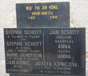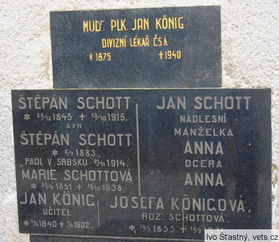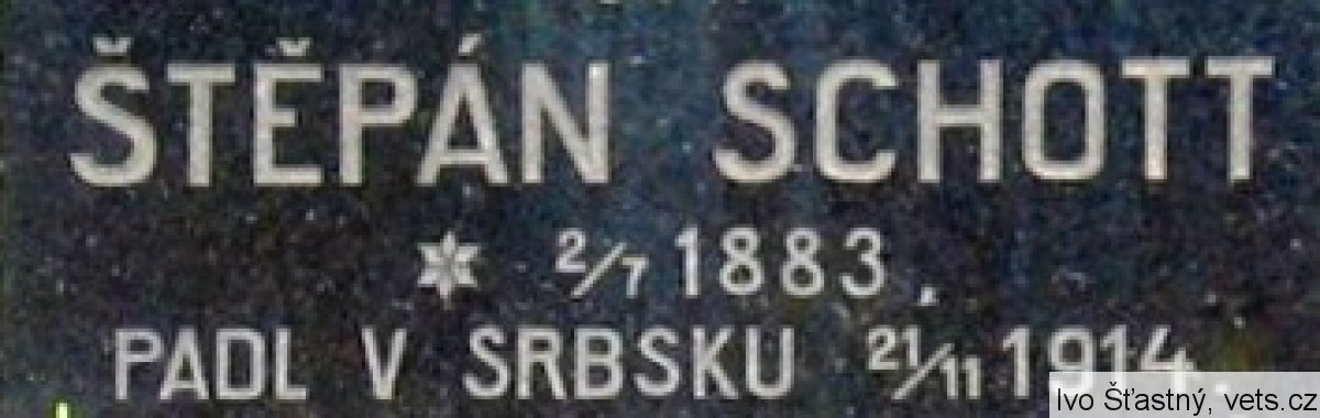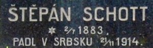Schott Štěpán: *2.7.1883 Klatovy, č. p. 160, do rodiny cukráře a měšťana Štěpána Schotta a Marie, roz. Hengstové. Svobodný. Lesní inženýr. EinjFreiw., tit. Korp., IR. Nr. 11, 4. ErsKomp. +21.11.1914 kóta 159, jižně od Kolumbara, Srbsko. Padl. Téhož dne na bojišti pohřben. (zdroj: VHÚ, https://www.portafontium.eu )