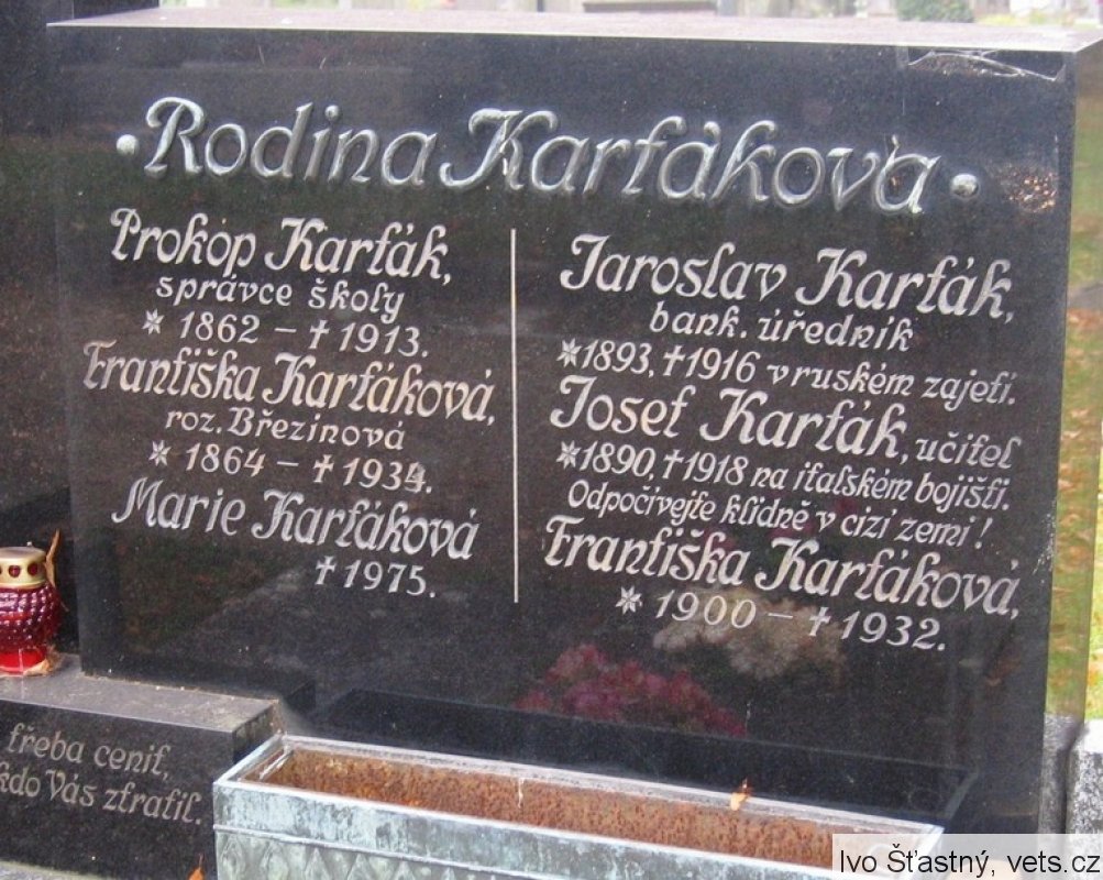 Karták Josef: *1890 Dolní Lukavice, tehdy okr. Přeštice, dnes Plzeň – jih. Příslušný Čečovice, tehdy okr. Přeštice, dnes Plzeň – jih. Svobodný, učitel. Einj.Freiw., Zugsf., Kadettaspirant, IR. Nr. 35, 2. FeldKomp. +2.2.1918 St. Vito a/d Piave, Valdobbiadene, okr. Treviso. Zabit výbuchem granátu. 3.2.1918 pohřben vojenský hřbitov u St. Pietro di Barbozza. (zdroj: VHÚ)
