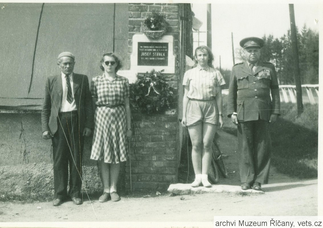V UPOMÍNKU NA JOSEFA STÁRKA KTERÝ POLOŽIL SVŮJ ŽIVOT ZA VLAST V KVĚTNOVÉ REVOLUCI R. 1945. VĚNUJE S.Č.M.