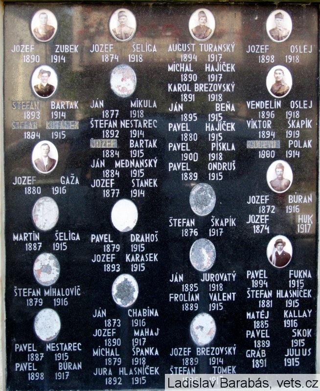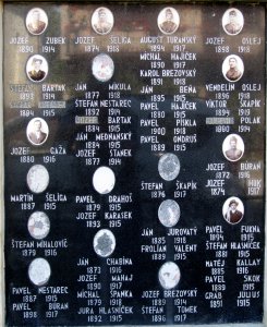 JOZEF ZUBEK 1890-1914, ŠTEFAN BARTAK 1893-1914, ŠTEFAN KUTÁLEK 1884-1915, JOZEF GAŽA 1880-1916, MARTIN ŠELIGA 1887-1915, ŠTEFAN MIHALOVIČ 1879-1916, PAVEL NESTAREC 1887-1915, PAVEL BÚRAN 1898-1917, JOZEF ŠELIGA 1874-1918, JÁN MIKULA 1877-1918, ŠTEFAN NESTAREC 1892-1914, JOZEF BARTAK 1884-1915, JÁN MEDNANSKÝ 1884-1915, JOZEF STANEK 1877-1914, PAVEL DRAHOŠ 1879-1915, JOZEF KARASEK 1893-1915, JÁN CHABINA 1873-1916, JOZEF MAHAJ 1890-1917, MICHAL ŠPANKA 1879-1918, JURA HLASNÍČEK 1892-1915, AUGUST TURANSKÝ 1894-1917, MICHAL HAJÍČEK 1890-1917, KAROL BREZOVSKÝ 1891-1918, JAN BEŇA 1895-1915, PAVEL HAJÍČEK 1880-1915, PAVEL PÍSKLA 1900-1918, PAVEL ONDRUŠ 1889-1915, ŠTEFAN ŠKAPÍK 1876-1917, JÁN JUOVATÝ 1885-1918, FROLIÁN VALENT 1889-1915, JOZEF BREZOVSKÝ 1889-1914, ŠTEFAN TOMEK 1896-1917, JOZEF OSLEJ 1898-1918, VENDELÍN OSLEJ 1896-1818, VIKTOR ŠKAPÍK 1894-1919, LUDEVÍT POLAK 1880-1914, JOZEF BÚRAN 1872-1916, JOZEF HUK 1874-1917, PAVEL FUKNA 1894-1915, ŠTEFAN HLASNÍČEK 1881-1915, MATĚJ KALLAY 1885-1916, PAVEL SKOK 1889-1915, GRÁB JULIUS 1891-1915