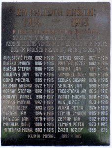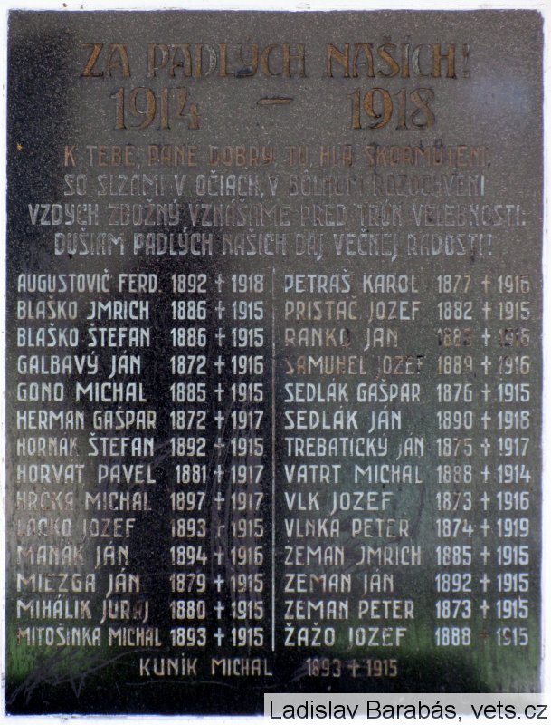 AUGUSTOVIČ FERD. 1892 †1918, BLAŠKO IMRICH 1886 †1915, BLAŠKO ŠTEFAN 1886 †1915, GALBAVÝ JÁN 1872 †1916, GONO MICHAL 1885 †1915, HERMAN GAŠPAR 1872 †1917, HORNÁK ŠTEFAN 1892 †1915, HORVÁT PAVEL 1881 †1917, HRČKA MICHAL 1897 †1917, LACKO JOZEF 1893 †1915, MANÁK JÁN 1894 †1916, MIEZGA JÁN 1879 †1915, MIHÁLIK JURAJ 1880 †1915, MITOŠINKA MICHAL 1893 †1915, PETRÁŠ KAROL 1877 †1916, PRISTAČ JOZEF 1882 †1915, RANKO JÁN 1883 †1916, SAMUHEL JOZEF 1889 †1916,