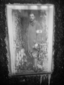 fotografie rakouského vojáka v zimním kabátě se zdravotnickou rukávovou páskou; dle pomníku padlých u místního kostela se jedná o Jana Mrzenu