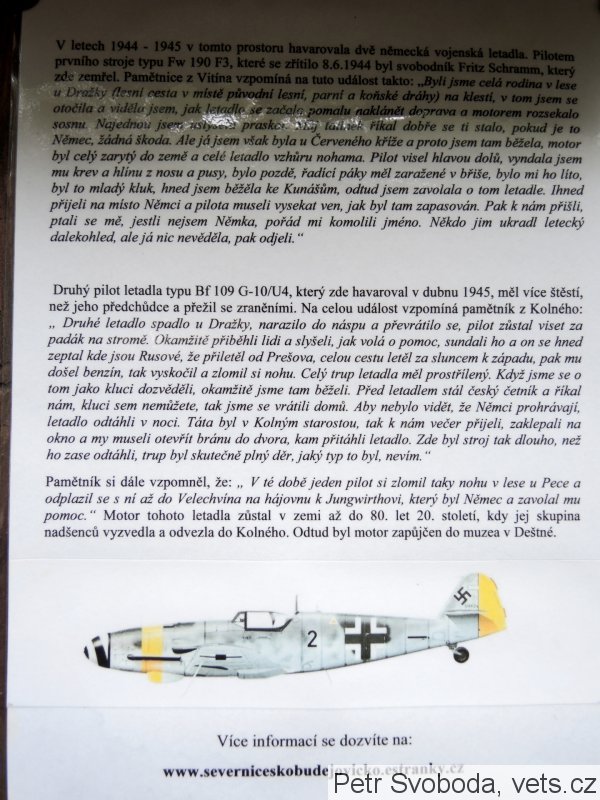 Druhý pilot letadla typu Bf 109 G-10/U4, který zde havaroval v dubnu 1945, měl více štěstí, než jeho předchůdce a přežil se zraněními. Na celou událost vzpomíná pamětník z Kolného: „ Druhé letadlo spadlo u Dražky, narazilo do náspu a převrátilo se, pilot zůstal viset za padák na stromě. Okamžitě přiběhli lidi a slyšeli, jak volá o pomoc, sundali ho a on se hned zeptal kde jsou Rusové, že přiletěl od Prešova, celou cestu letěl za sluncem k západu, pak mu došel benzín, tak vyskočil a zlomil si nohu. Celý trup letadla měl prostřílený. Když jsme se o tom jako kluci dozvěděli, okamžitě jsme tam běželi. Před letadlem stál český četník a říkal nám, kluci sem nemůžete, tak jsme se vrátili domů. Aby nebylo vidět, že Němci prohrávají, letadlo odtáhli v noci. Táta byl v Kolným starostou, tak k nám večer přijeli, zaklepali na okno a my museli otevřít bránu do dvora, kam přitáhli letadlo. Zde byl stroj tak dlouho, než ho zase odtáhli, trup byl skutečně plný děr, jaký typ to byl, nevím.“
