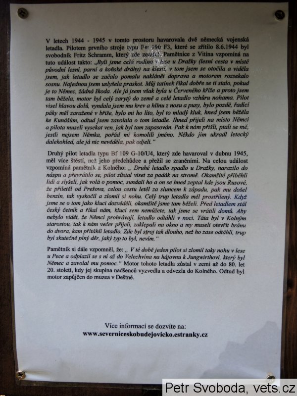 V letech 1944 - 1945 v tomto prostoru havarovala dvě německá vojenská letadla. Pilotem prvního stroje typu Fw 190 F3, které se zřítilo 8.6.1944 byl svobodník Fritz Schramm, který zde zemřel. Pamětnice z Vitína vzpomíná na tuto událost takto: „Byli jsme celá rodina v lese u Dražky (lesní cesta v místě původní lesní, parní a koňské dráhy) na klestí, v tom jsem se otočila a viděla jsem, jak letadlo se začalo pomalu naklánět doprava a motorem rozsekalo sosnu. Najednou jsem uslyšela praskot. Můj tatínek říkal dobře se ti stalo, pokud je to Němec, žádná škoda. Ale já jsem však byla u Červeného kříže a proto jsem tam běžela, motor byl celý zarytý do země a celé letadlo vzhůru nohama. Pilot visel hlavou dolů, vyndala jsem mu krev a hlínu z nosu a pusy, bylo pozdě, řadící páky měl zaražené v břiše, bylo mi ho líto, byl to mladý kluk, hned jsem běžěla ke Kunášům, odtud jsem zavolala o tom letadle. Ihned přijeli na místo Němci a pilota museli vysekat ven, jak byl tam zapasován. Pak k nám přišli, ptali se mě, jestli nejsem Němka, pořád mi komolili jméno. Někdo jim ukradl letecký dalekohled, ale já nic nevěděla, pak odjeli.“