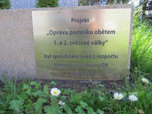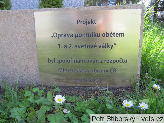 Na pomníku cedule: Projekt "Oprava pomníku obětem 1. a 2. světové války" byl spolufinancován z rozpočtu Ministerstva obrany ČR v roce 2013. Autorem pomníku je Vincenc Havel (více zde: http://www.opava-city.cz/scripts/detail.php?id=2460 )