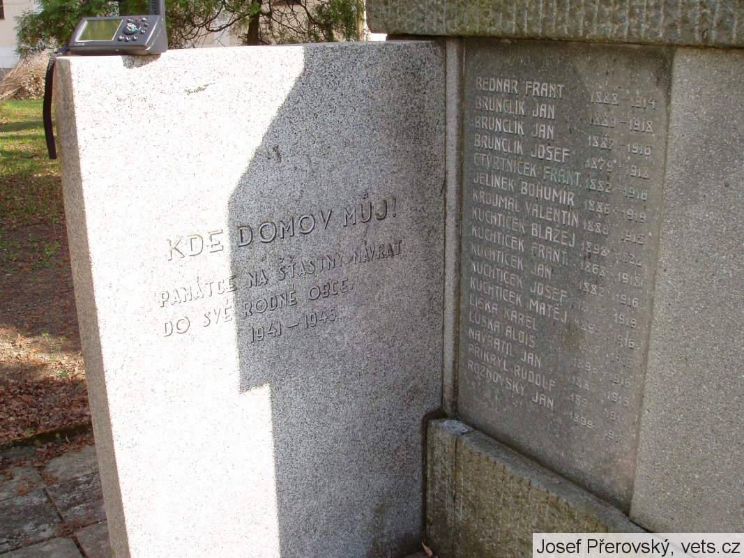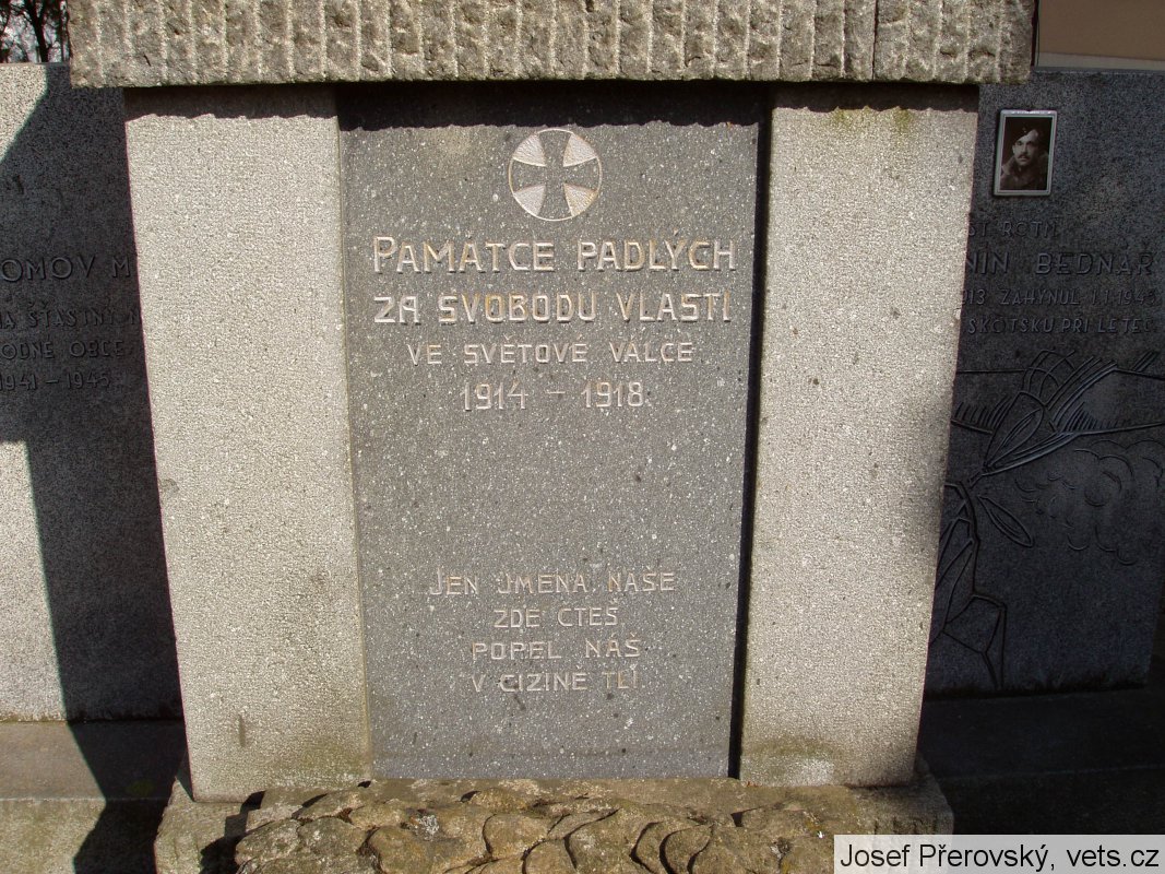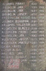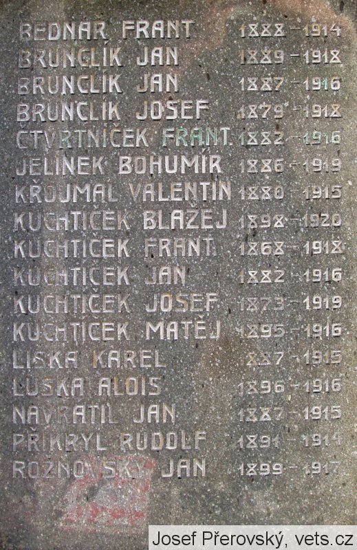 BEDNÁŘ FRANT. 1888-1914, BRUNCLÍK JAN 1889-1918, BRUNCLÍK JAN 1887-1916, BRUNCLÍK JOSEF 1879-1918, ČTVRTNÍČEK FRANT. 1882-1916, JELÍNEK BOHUMÍR 1886-1919, KŘOUMAL VALENTIN 1880-1915, KUCHTÍČEK BLAŽEJ 1898-1920, KUCHTÍČEK FRANT. 1868-1918, KUCHTÍČEK JAN 1882-1916, KUCHTÍČEK JOSEF 1873-1919, KUCHTÍČEK MATĚJ 1895-1916, LIŠKA KAREL 1887-1915, LIŠKA ALOIS 1896-1916, NAVRÁTIL JAN 1887-1915, PŘIKRYL RUDOLF 1891-1914, ROŽNOVSKÝ JAN 1899-1917