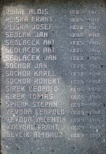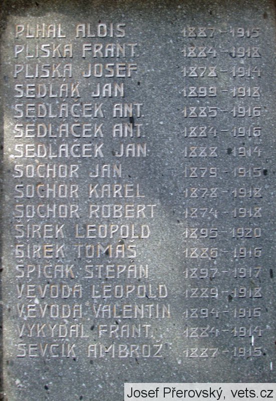 PLHAL ALOIS 1887-1915, PLISKA FRANT. 1884-1918, PLISKA JOSEF 1878-1914, SEDLÁK JAN 1899-1918, SEDLÁČEK ANT. 1885-1916, SEDLÁČEK ANT. 1884-1916, SEDLÁČEK JAN 1888-1914, SOCHOR JAN 1879-1915, SOCHOR KAREL 1878-1918, SOCHOR ROBERT 1874-1918, ŠÍREK LEOPOLD 1895-1920, ŠÍREK TOMÁŠ 1885-1916, ŠPIČÁK ŠTĚPÁN 1897-1917, VÉVODA LEOPOLD 1889-1918, VÉVODA VALENTIN 1894-1916, VYKYDAL FRANT. 1884-1914, ŠEVČÍK AMBROŽ 1887-1915