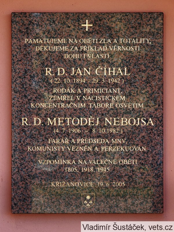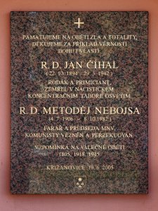Pamětní deska nazvaná „Pamětní deska obětem zla a nesvobody“ byla odhalena v neděli 19.6.2005 z iniciativy Konfederace politických vězňů a římskokatolické farnosti v Křižanovicích. Jsou na ní uvedeny dvě oběti totalitních režimů z řad duchovenstva – Jan Číhal (popravený za nacistického režimu) a Metoděj Nebojsa (vězněný a pronásledovaný za komunistického režimu).