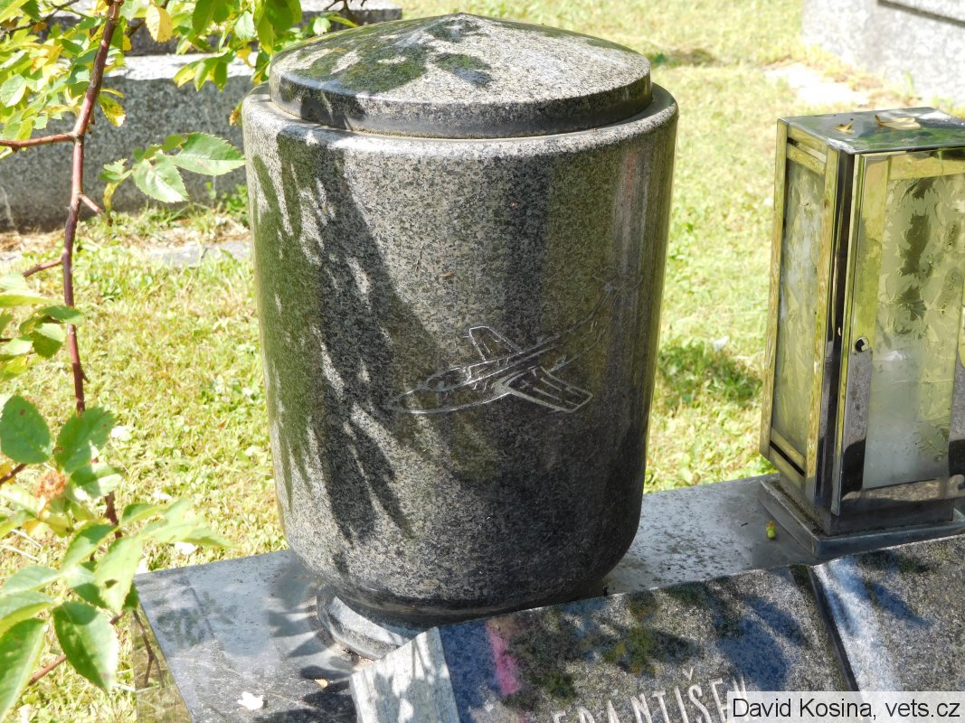 Úmrtí v mladém věku, na urně zobrazen stíhací letoun.