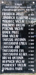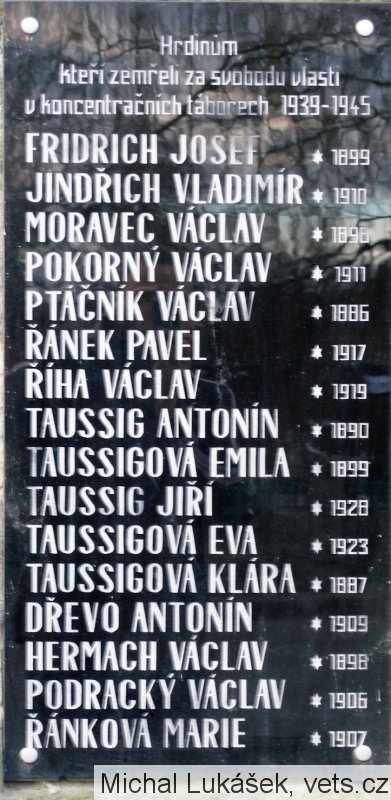 FRIDRICH JOSEF * 1899, JINDŘICH VLADIMÍR * 1910, MORAVEC VÁCLAV * 1898, POKORNÝ VÁCLAV * 1911, PTÁČNÍK VÁCLAV * 1886, ŘÁNEK PAVEL * 1917, ŘÍHA VÁCLAV * 1919, TAUSSIG ANTONÍN * 1890, TAUSSIGOVÁ EMILA * 1899, TAUSSIG JIŘÍ * 1928, TAUSSIGOVÁ EVA * 1923, TAUSSIGOVÁ KLÁRA * 1887, DŘEVO ANTONÍN * 1909, HERMACH VÁCLAV * 1998, PODRACKÝ VÁCLAV * 1906, ŘÁNKOVÁ MARIE * 1907