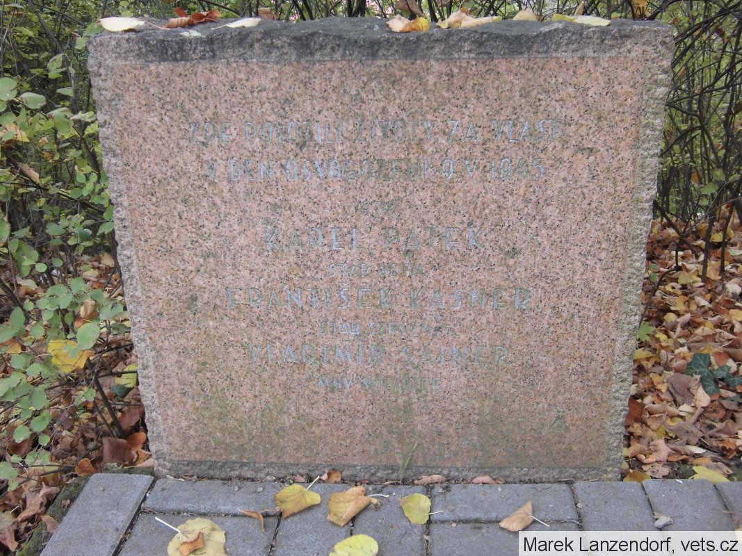 K. Pátek, F. Kasner a V Sainer přišli o život tak, že jeli v Sainerově automobilu 9. května 1945 po půlnoci do Slaného naproti Rudé armádě a nad Knovízí v sadech byli na horizontu zpozorováni sovětskými tankisty, kteří na automobil vystřelili, neboť je považovali za Němce. Pomník byl převezen na toto místo od Knovíze, kde původně stával.
