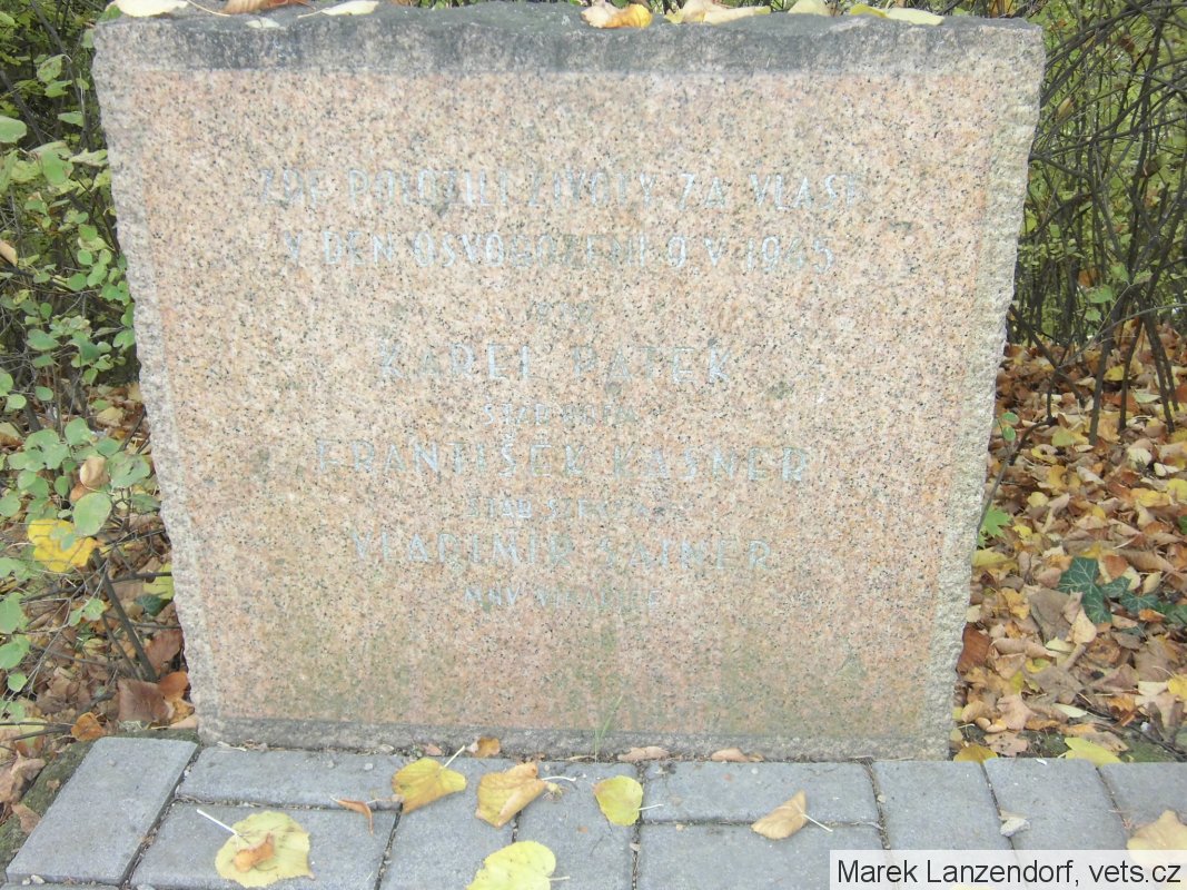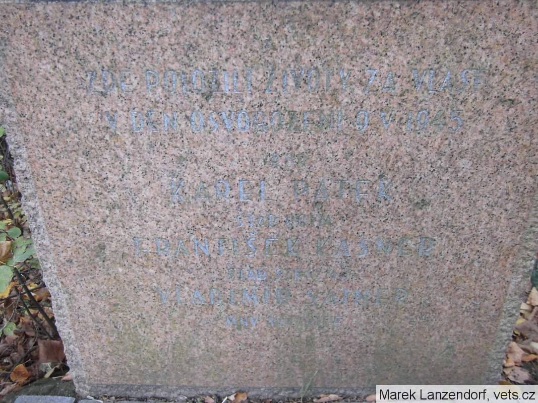 Npor. Karel Pátek, *20.11.1899, +9.5.1945 u Knovíze. Pohřben do rodinného hrobu na hřbitově ve Vinařicích dne 13.5.1945.