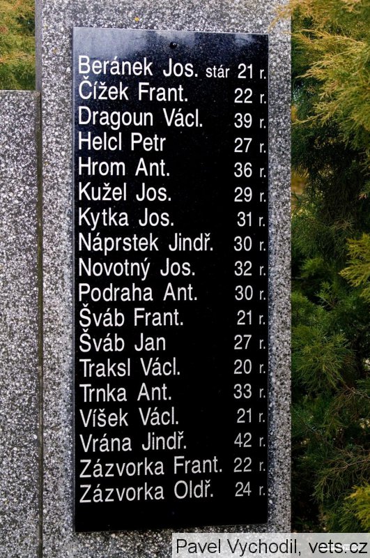 Beránek Jos. stár 21 r., Čížek Frant. 22 r., Dragoun Václ. 39 r., Helc Petr 27 r., Hrom Ant. 36 r., Kužel Jos. 29 r., Kytka Jos. 31 r., Náprstek Jindř. 30 r., Novotný Jos. 32 r., Podraha Ant. 30 r., Šváb Frant. 21 r., Šváb Jan 27 r., Traksl Václ. 20 r., Trnka Ant. 33 r., Víšek Václ. 21 r., Vrána Jindř. 42 r., Zázvorka Frant. 22 r., Zázvorka Oldř. 24 r.