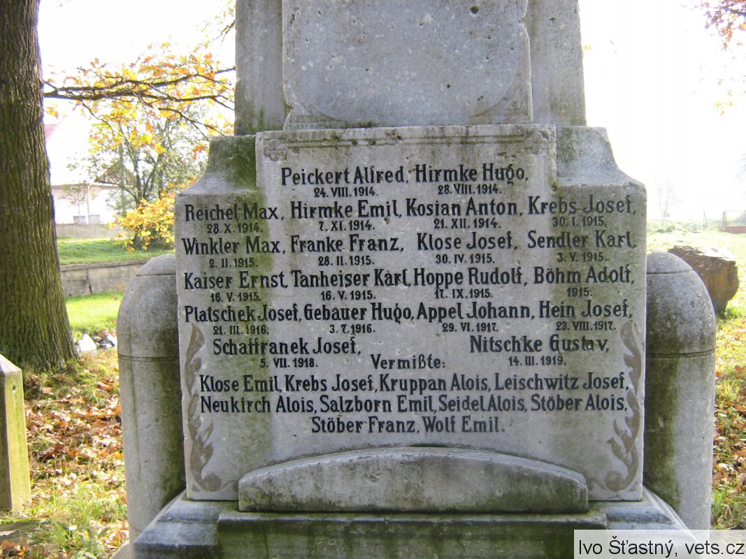 Umístění: Bohušov, střed obcePeickert Alfred 24. VIII. 1914, Hirmke Hugo 28. VIII. 1914, Reichel Max 28. X. 1914, Hirmke Emil 7. XI. 1914, Kosian Anton 21. XII. 1914, Krebs Josef 30. I. 1915, Winkler Max 2. II. 1915, Franke Franz 29. II. 1915, Klose Josef 30. IV. 1915, Sendler Karl 3. V. 1915, Kaiser Ernst 16. V. 1915, Tanheiser Karl 16. V. 1915, Hoppe Rudolf 17. IX. 1915, Böhm Adolf 1915, Platschek Josef 21. III. 1916, Gebauer Hugo 3. 7. 1916, Appel Johann 29. VI. 1917, Hein Josef 23. VIII. 1917, Schaffranek Josef 5. VII. 1918, Nitschke Gustav 14. III. 1919.