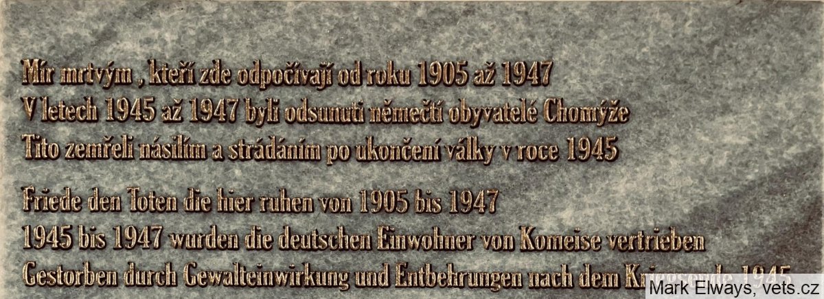 Umístění: Krnov, Albrechtická, kostel Panny Marie na hřbitově v místní části ChomýžMír mrtvým, kteří zde odpočívají od roku 1905 až 1947