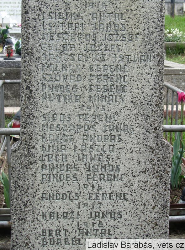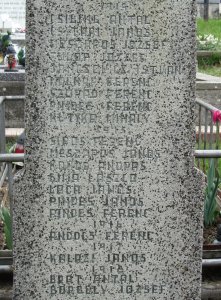 Na oboch stranách nápisu v spodnej časti pomníka je, akoby súčasť nápisu, iným typom písma takmer nečitateľný text: TAKÁCS ISTVÁN CSINALT ATA 1959. Pravdepodobne ide o signatúru a rok zhotovenia.