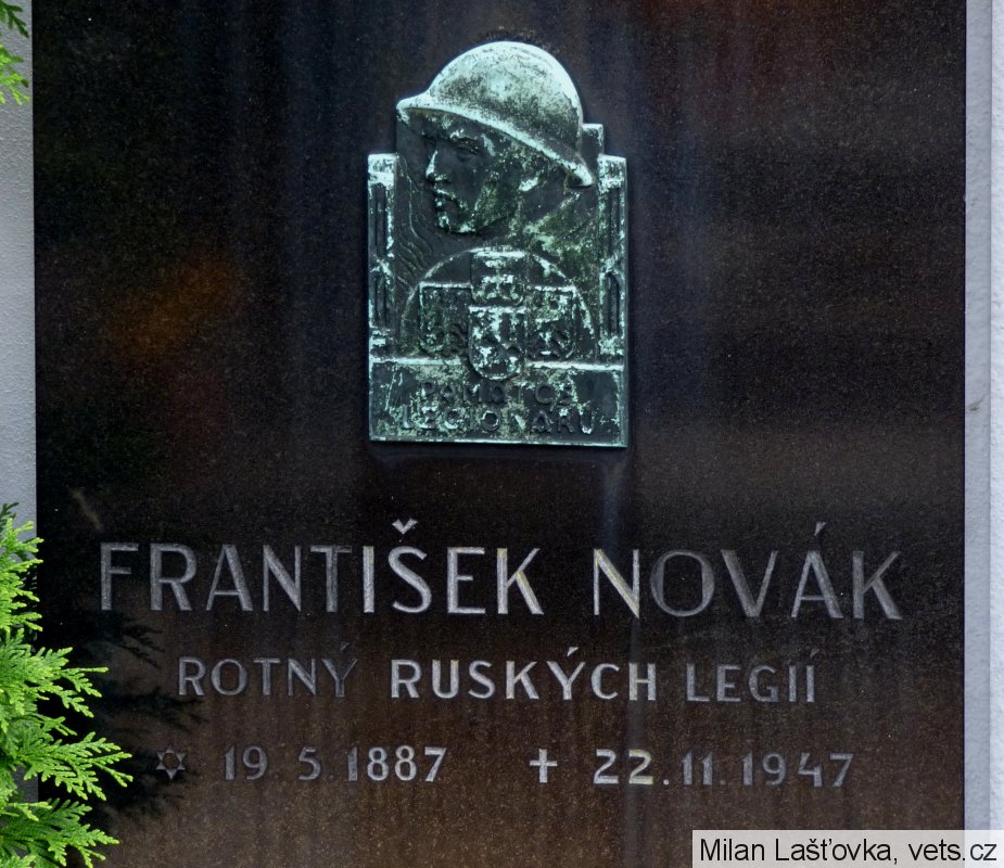 Novák František: *19.5.1886 (na náhrobku 1887) Tišice, okr. Brandýs nad Labem. Příslušný tamtéž. Zaměstnání: kancelářský pomocník. RU armáda: Feldw., Eisenb. R., Nr. ?. Zajetí: 9.3.1915 Přemyšl. Datum a místo přihlášení do legií: Ligat. Legie: Čs. legie v Rusku Zařazení do legie: 1.1.1917. První a poslední útvar v legiích: 4.stř.pl. První hodnost: vojín, poslední: desátník. Konec v legiích: 1.6.1920.