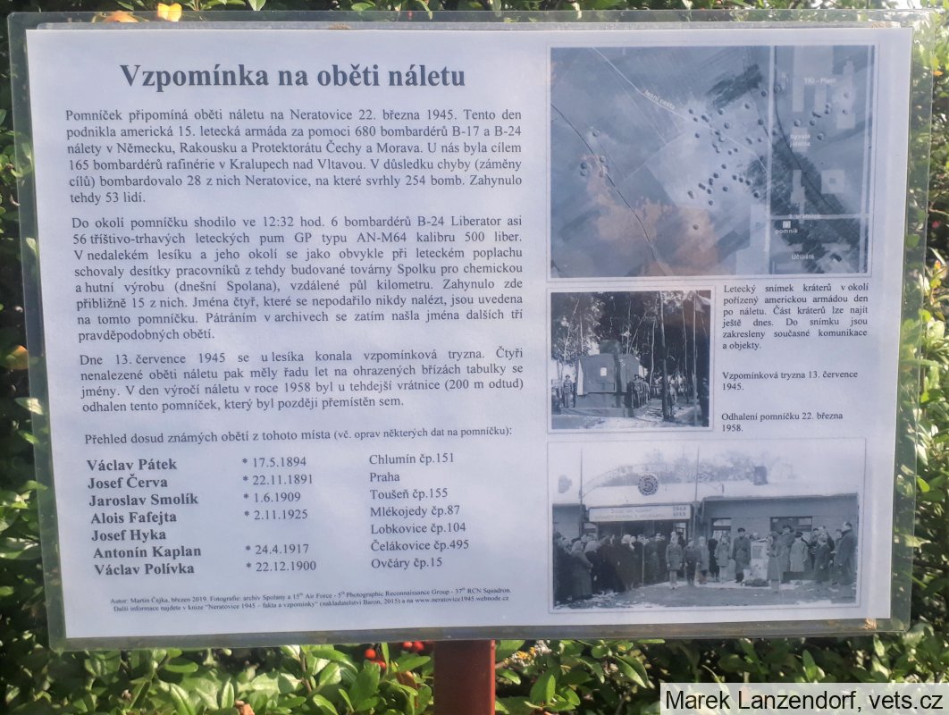 Autor: Martin Čejka, březen 2019. Fotografie: archiv Spolany a 15th Air Force - 5th Photographic Reconnaissance Group - 37th RCN Squadron. Další informace najdete v knize “Neratovice 1945 - fakta a vzpomínky“ (nakladatelství Baron, 2015) a na www.neratovice1945.webnode.cz