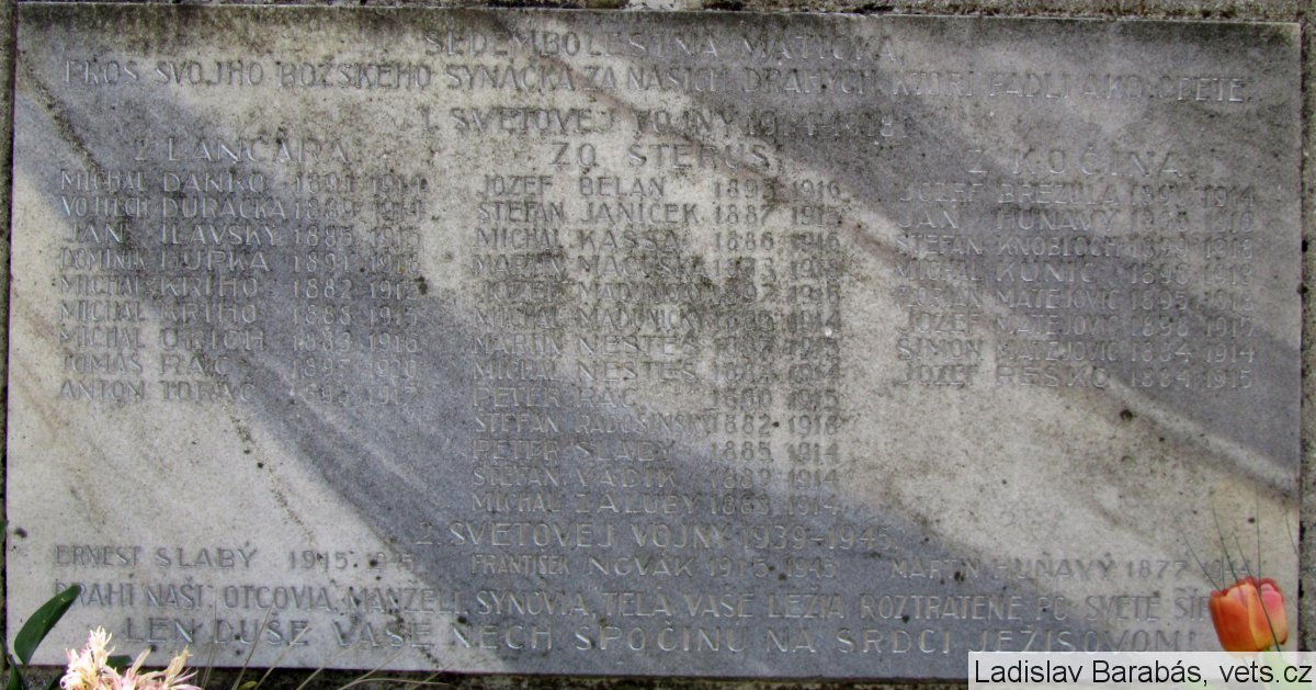 JOZEF BELAN 1895 1916, ŠTEFAN JANÍČEK 1887 1915, MICHAL KAŠŠA 1886 1916, MARTIN MACUŠKA 1873 1918, JOZEF MADUNICKÝ 1897 1916, MICHAL MADUNICKÝ 1885 1914, MARTIN NESTÉŠ 1887 1915, MICHAL NESTÉŠ 1884 1914, PETER RÁC 1880 1915, ŠTEFAN RADOŠINSKÝ 1882 1918, PETER SLABÝ 1885 1914, ŠTEFAN VADÍK 1889 1914, MICHAL ZÁLUBY 1883 1914