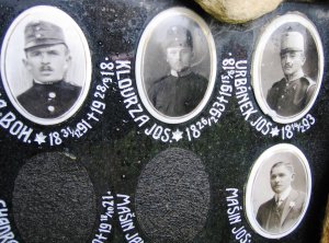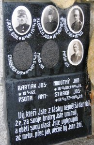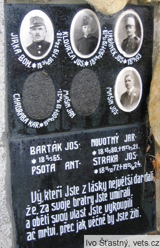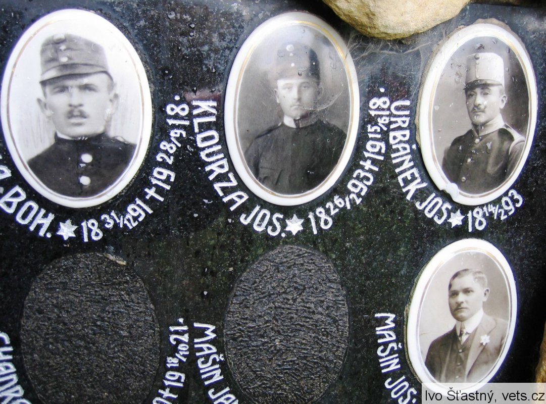 JIRKA BOH. *31.12.1891 +28.9.1918, KLOURZA JOS. *26.2.1893 +15.6.1918, URBÁNEK JOS. *14.2.1893, CHADRABA KAR. *24.5.1900 +18.10.1921, MAŠÍN JAN, MAŠÍN JOS.
