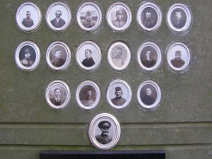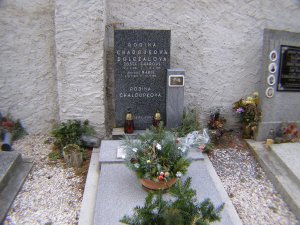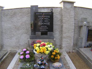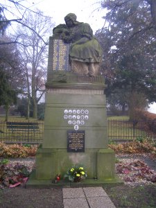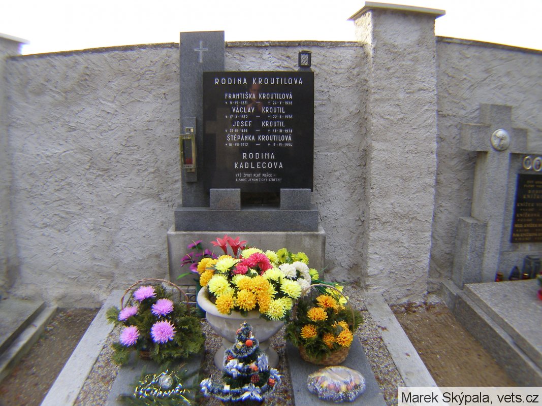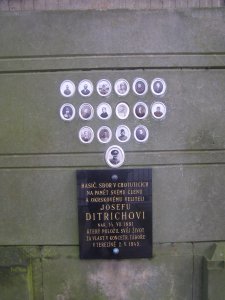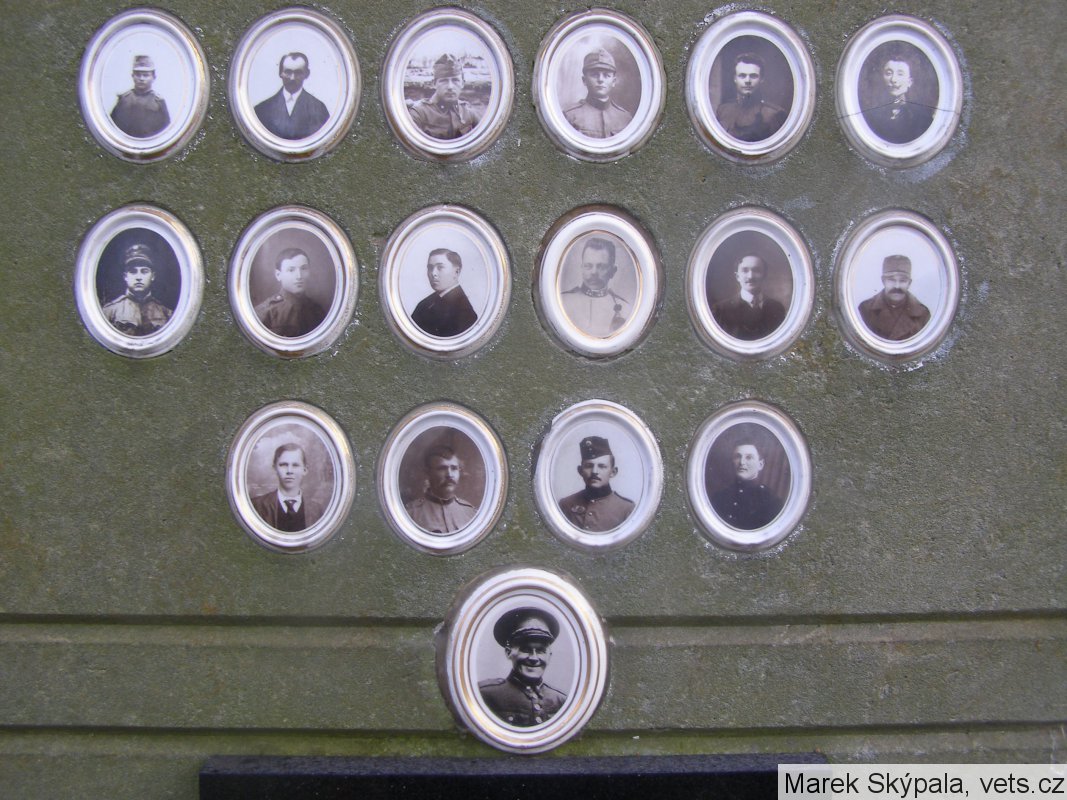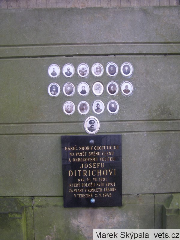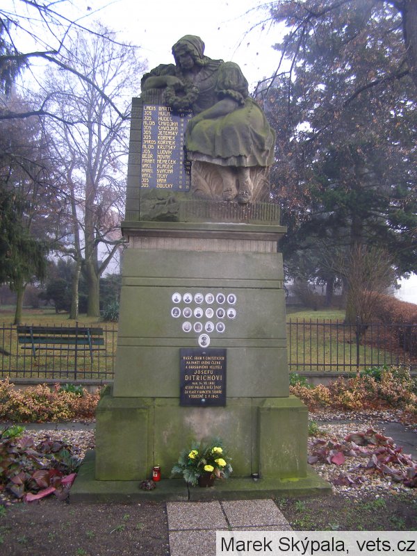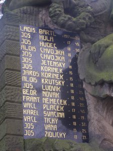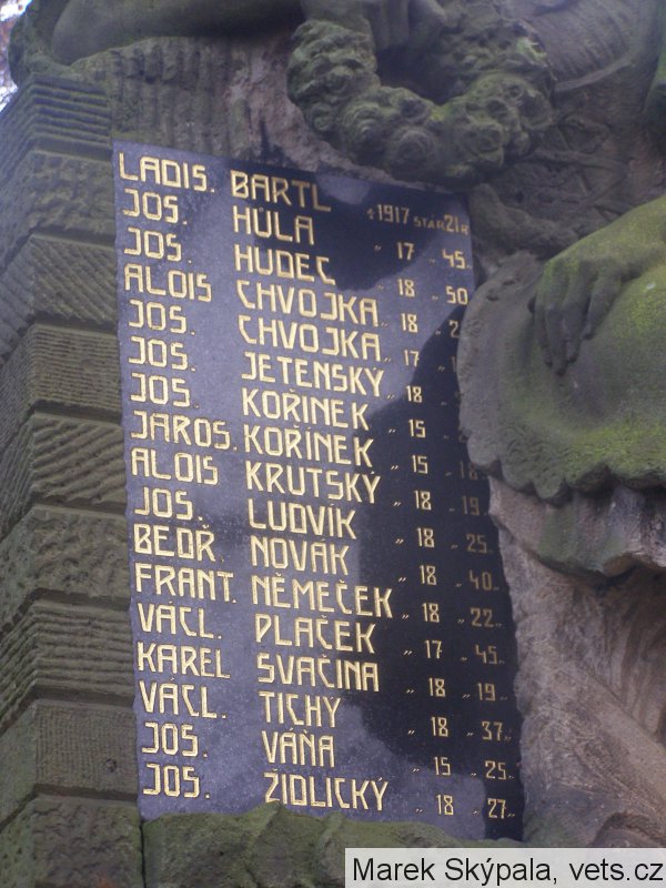 rok úmrtí Aloise a Josefa Chvojky, Josefa Jetenského a Josefa Křínka je částečně kryt převisem sochy.
