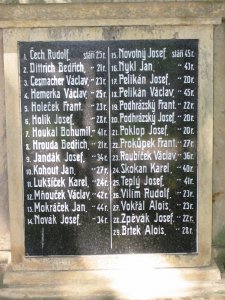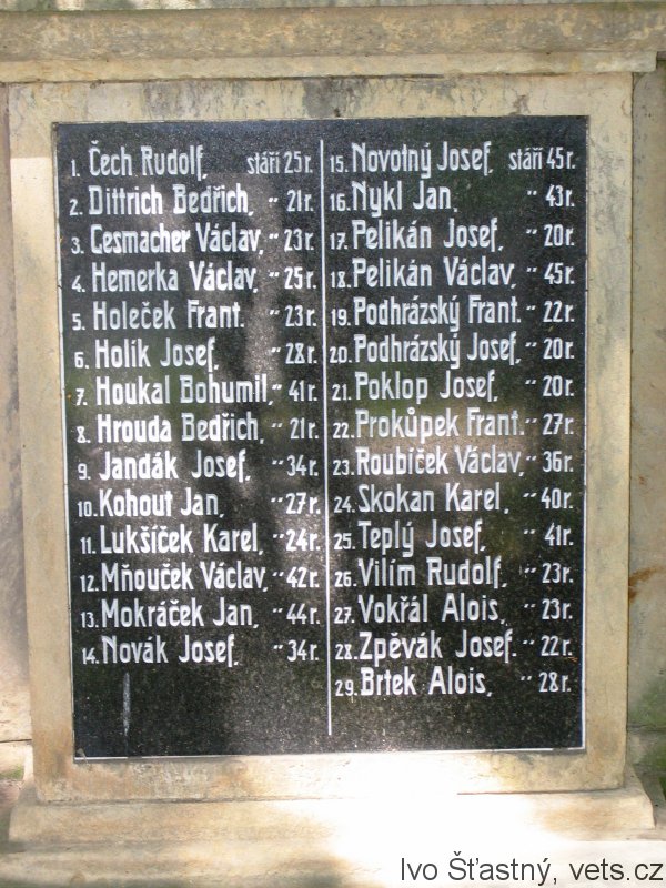 1. Čech Rudolf stáří 25 r., 2. Dittrich Bedřich stáří 21 r., 3. Gesmacher Václav stáří 23 r., 4. Hemerka Václav stáří 25 r., 5. Holeček Frant. stáří 23 r., 6. Holík Josef stáří 28 r., 7. Houkal Bohumil stáří 41 r., 8. Hrouda Bedřich stáří 21 r., 9. Jandák Josef stáří 34 r., 10. Kohout Jan stáří 27 r., 11. Lukšíček Karel stáří 24 r., 12. Mňouček Václav stáří 42 r., 13. Mokráček Jan stáří 44 r., 14. Novák Josef stáří 34 r., 15. Novotný Josef stáří 45 r., 16. Nykl Jan stáří 43 r., 17. Pelikán Josef stáří 20 r., 18. Pelikán Václav stáří 45 r., 19. Podhrázský Frant. stáří 22 r., 20. Podhrázský Josef stáří 20r., 21. Poklop Josef stáří 20 r., 22. Prokůpek Frant. stáří 27 r., 23. Roubíček Václav stáří 36 r., 24. Skokan Karel stáří 40 r., 25. Teplý Josef stáří 41 r.,26. Vilím Rudolf stáří 23 r., 27. Vokřál Alois stáří 23 r., 28. Zpěvák Josef stáří 22 r., 29. Brtek Alois stáří 28 r.