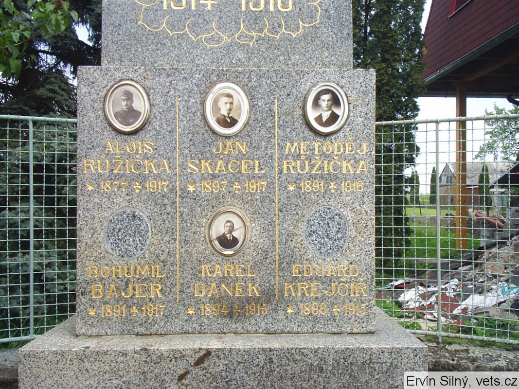 ALOIS RŮŽIČKA *1877 +1917, JAN SKÁCEL *1897 +1917, METODĚJ RŮŽIČKA *1891 +1916, BOHUMIL BAJER *1891 +1917, KAREL DANĚK *1894 +1915, EDUARD KREJČÍŘ *1896 +1915