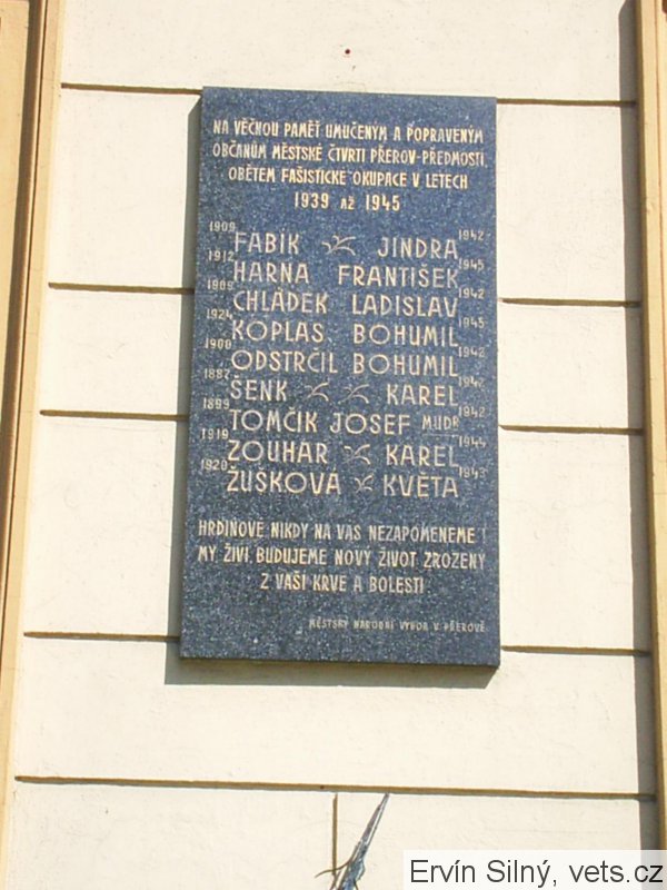 FABÍK JINDRA 1909-1942, HARNA FRANTIŠEK 1912-1945, CHLÁDEK LADISLAV 1909-1942, KOPLAS BOHUMIL 1924-1945, ODSTRČIL BOHUMIL 1900-1942, ŠENK KAREL 1887-1942, MUDR. TOMČÍK JOSEF 1899-1942, ZOUHAR KAREL 1919-1944, ŽUŠKOVÁ KVĚTA 1920-1943