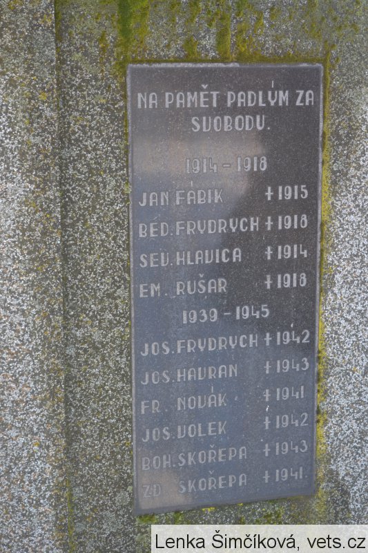JOS. FRYDRYCH +1942, JOS. HAVRAN +1943, FR. NOVÁK +1941, JOS. VOLEK +1942, BOH. SKOŘEPA +1943, ZD. SKOŘEPA +1941.