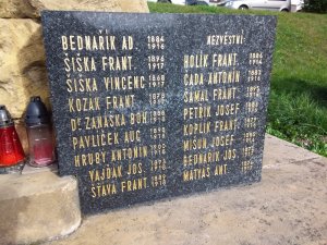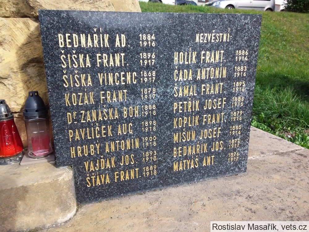 BEDNAŘÍK AD. 1884-1916, ŠIŠKA FRANT. 1896-1917, ŠIŠKA VINCENC 1868-1917, KOZÁK FRANT. 1878-1917, DR. ZANÁŠKA BOH. 1888-1918, PAVLÍČEK AUG. 1898-1918, HRUBÝ ANTONÍN 1900-1918, VAJĎÁK JOS. 1893-1918, ŠŤÁVA FRANT. 1889-1918
