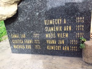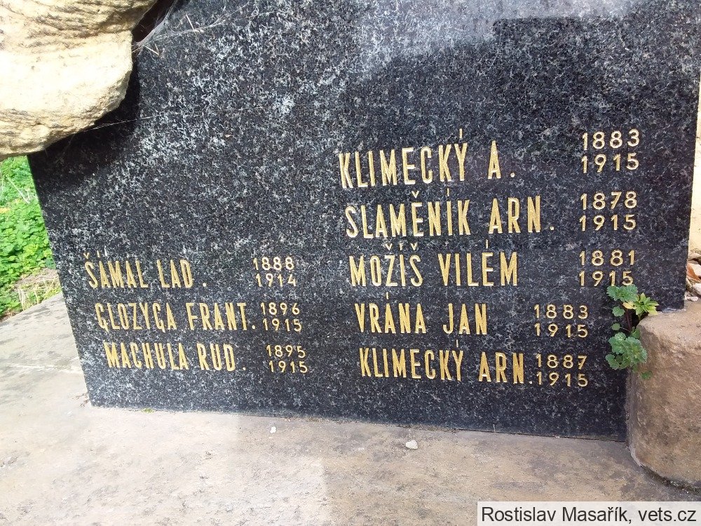 ŠÁMAL LAD. 1888-1914, GLOZYGA FRANT. 1896-1915, MACHULA RUD. 1895-1915, KLIMECKÝ A. 1893-1915, SLAMĚNÍK ARN. 1878-1915, MOŽÍŠ VILÉM 1881-1915, VRÁNA JAN 1883-1915, KLIMECKÝ ARN. 1887-1915
