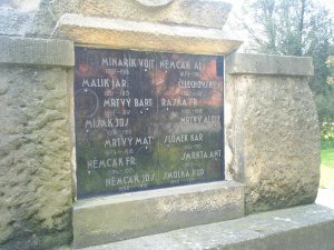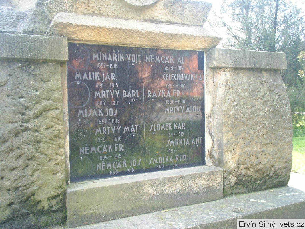 MINAŘÍK VOJT. 1897 - 1916, NĚMČÁK AL. 1873-1914, MALÍK JAR. 1891-1915, ČELECHOVSKÝ A. 1897-1917, MRTVÝ BART. 1883-1917, RAŠKA FR. 1888-1918, MIŠÁK JOS. 1898-1918, MRTVÝ ALOIS 1898-1917, MRTVÝ MAŤ. 1879-1916, SLOMEK KAR. 1892-1915, NĚMČÁK FR. 1894-1915, SMRKTA ANT. 1895 - , NĚMČÁK JOS. 1896-1915, SMOLKA RUD. 1889-1917