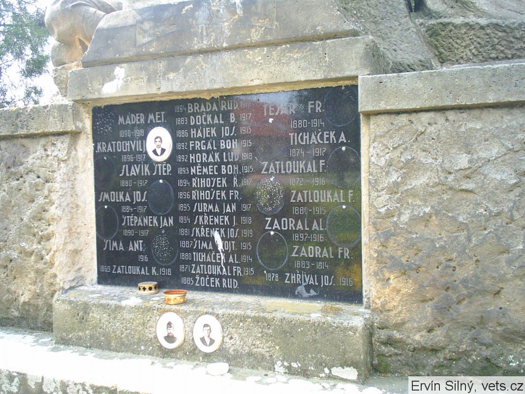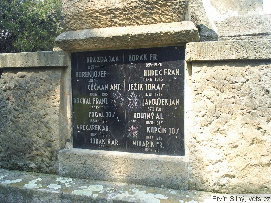 MÁDER MET. 1890-1918, KRATOCHVÍL J 1896-1917, SLAVÍK ŠTĚP. 1880-1917, SMOLKA JOS. 1884-1917, ŠTĚPÁNEK JAN 1890-1917, ŠÍMA ANT. 1916, ZATLOUKAL K. 1869-1918, TESAŘ FR. 1880-1914, TICHÁČEK A. 1874-1917, ZATLOUKAL F. 1872-1916, ZATLOUKAL F. 1880-1915, ZAORAL AL. 1897-1916, ZAORAL FR. 1883-1914, ZHŘÍVAL JOS. 1878- 1916, BRADA RUD. 1894-1917, DOČKAL B. 1883-1917, HÁJEK JOS. 1886-1915, FRGÁL BOH. 1892-1915, HORÁK LUD. 1892-1918, NĚMEC BOH. 1893-1915, ŘIHOŠEK R. 1894-1917, ŘIHOŠEK FR. 1896-, SURMA JAN 1895-1917, SKŘENEK J. 1894-1918, SKŘENEK JOS. 1881-1919, ŠÍMA VOJT. 1887-1915, TICHÁČEK AL. 1880-1914, ZATLOUKAL FR. 1871-1915, ŽOČEK RUD. 1885