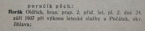 Pozorovatel por. Oldřich Horák a pilot František Hrazdira zahynuli 24.9.1937 při letecké nehodě v Horních Dubenkách, okr. Jihlava. V mlze zachytili o střechu domu a spadli do dvora. Zpráva o smrti Oldřicha Horáka ve Věstníku MNO – část osobní, 1937, str. 348 uvádí místo úmrtí „u Počátek“, což je menší město, vzdálené 5km od Horních Dubenek.