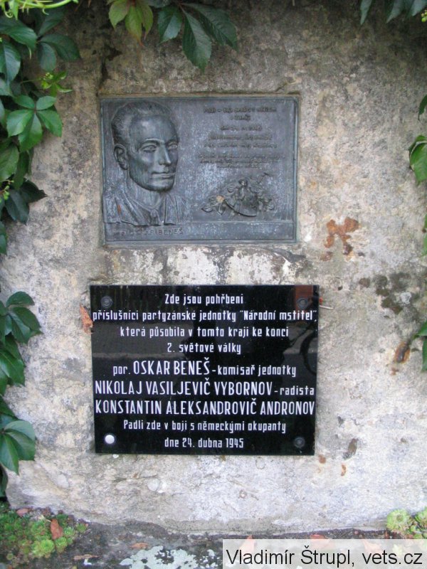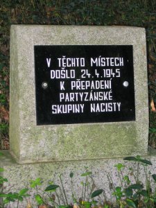 Nad vchodem byla dříve umístěna pamětní deska. Připomínala, že zde na jaře 1945 byl dočasný úkryt štábu partyzán. oddílu Národní mstitel. Velitelem byl mjr. RA Pavel Alexejevič Kaniščev.