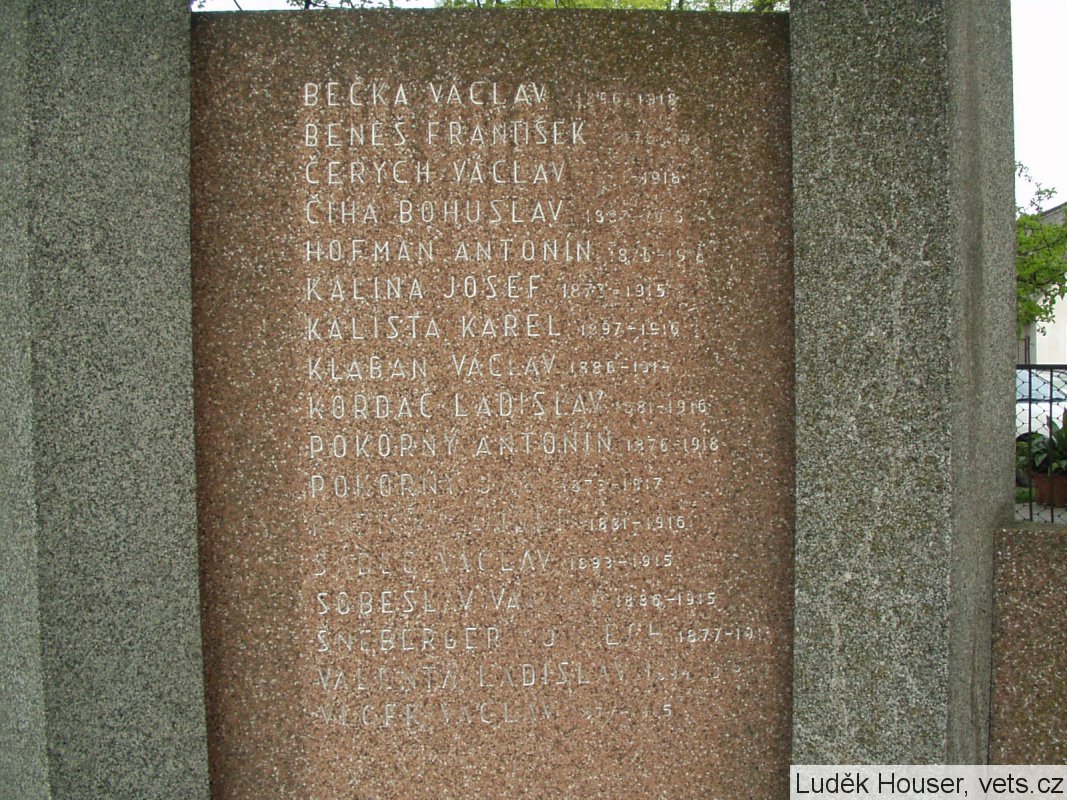 BEČKA VÁCLAV 1896-1918, BENEŠ FRANTIŠEK 1876-1915, ČERYCH VÁCLAV 1891-1918, ČÍHA BOHUSLAV 1887-1916, HOFMAN ANTONÍN 1876-1918, KALINA JOSEF 1873-1915, KALISTA KAREL 1897-1916, KLABAN VÁCLAV 1886-1914, KORDAČ LADISLAV 1881-1916, POKORNÝ ANTONÍN 1876-1918, POKORNÝ JAN 1876-1918, RŮŽIČKA ADOLF 1873-1917, SÁDLO VÁCLAV 1893-1915, SOBĚSLAV VÁCLAV 1886-1915, ŠNEBERGER VOJTĚCH 1877-1918, VALENTA LADISLAV 1894-1915, VLČEK VÁCLAV 1877-1915