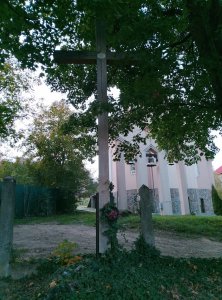 V horní části hřbitova centrální dřevěný kříž opatřený tabulkou s textem: 1914-1918 (zbytex textu nečitelný)