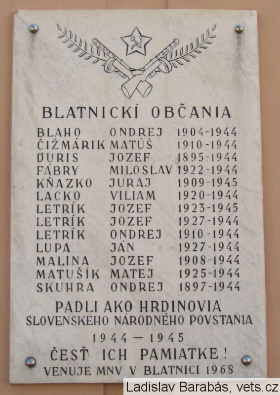 BLAHO ONDREJ 1904-1944, ČIŽMÁRIK MATÚŠ 1910-1944, ĎURIS JOZEF 1895-1944, FÁBRY MILOSLAV 1922-1944, KŇAZKO JURAJ 1909-1945, LACKO VILIAM 1920-1944, LETRÍK JOZEF 1923-1945, LETRÍK JOZEF 1927-1944, LETRÍK ONDREJ 1910-1944, LUPA JÁN 1927-1944, MALINA JOZEF 1904-1944, MATUŠÍK MATEJ 1925-1944, SKUHRA ONDREJ 1897-1944