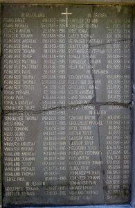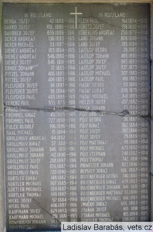 IN RUSSLAND: BENDA JOSEF 42. 1888-1918, DANKO JOSEF KOL. 1886-1918, DAUBNER JOSEF 659. 1889-1916, DERER ANDREAS 136. 1893-1915, DERER MICHAEL 53. 1887-1918, DIENES ANDREAS 103. 1894-1915, DIENES ANDREAS 546. 1880-1916, DIENES JOSEF 546. 1891-1915, ERNEK JOHANN 17. 1885-1914, FITZEL JOHANN 406. 1895-1916, FITZEL JOSEF 406. 1883-1918, FLEISCHER JOSEF 96. 1897-1916, FLEISCHER JOSEF 96. 1894-1915, FLEISCHER PAUL 485. 1893-1915, FERENZ PAUL 933. 1875-1918, FRANZ PAUL 4. 1887-1915, FRÖMMEL IGNAZ 451. 1885-1915, FRÖMMEL PAUL 727. 1890-1916, FULEK RUDOLF 196. 1896-1918, GAAL MICHAEL 15. 1894-1914, GROLLMUSS ANDREAS 64. 1882-1914, GROLLMUSS IGNAZ 57. 1888-1914, GROLLMUSS JOHANN 846. 1891-1916, GROLLMUSS JOHANN 142. 1890-1916, GROLLMUSS JOSEF 288. 1897-1916, GROLLMUSS PAUL 826. 1887-1914, GROLLMUSS PAUL 720. 1890-1915, GÜRTLER LUKAS 144. 1882-1914, GÜRTLER MICHAEL 807. 1885-1914, GÜRTLER MICHAEL 124. 1887-1918, GÜRTLER THOMAS 399. 1897-1916, HICKL JOSEF 517. 1884-1914, HICKL PAUL 606. 1897-1914, KAUFMANN JOSEF 629. 1883-1918, KAUFMANN MICHAEL 251. 1881-1915, HOWORITSCH JOHANN 363. 1880-1916, PÖSS MATTHIAS 556. 1884-1916, KLEIN PAUL 164. 1894-1915, KORETZ JOSEF 158. 1890-1915, KÖBERLING ANDREAS 259. 1879-1914, LANG JOHANN 809. 1889-1916, LANG JOSEF 185. 1894-1915, LASSLOP GEORG 28. 1885-1918, LASSLOP JOHANN 465. 1890-1914, LASSLOP JOSEF 865. 1893-1915, LASSLOP JOSEF 537. 1873-1916, LASSLOP MICHAEL 307. 1883-1916, LASSLOP PAUL 169. 1883-1915, MADAY GEORG 63. 1890-1915, MADAY LUKAS 938. 1879-1914, MADAY MICHAEL 841. 1893-1917, MELZER JOSEF 457. 1882-1914, PISCH JOHANN 23. 1894-1915, PÖSS ANDREAS 1887-1914, PÖSS GEORG 36. 1887-1915, PÖSS IGNAZ 362. 1884-1914, PÖSS JOSEF 747. 1886-1915, PÖSS JOSEF 25. 1889-1916, PÖSS MATTHIAS 99. 1888-1914, PÖSS MICHAEL 670. 1892-1918, PÖSS STEPHAN 240. 1882-1914, PÖSS THOMAS 742. 1891-1916, PRIWITZER JOHANN 822. 1896-1916, REPISKÝ JURAJ KOL. 1887-1918, ROSENBERGER GEORG 740. 1886-1914, ROSENBERGER IGNAZ 678. 1883-1916, ROSENBERGER JOHANN 661. 1881-1917, ROSENBERGER MATTHIAS 33. 1886-1918, ROSENBERGER MICHAEL 661. 1893-1914, SMAČKO JURAJ KOL. 1883-1915, STAŇÁK JOSEF 165. 1891-1914, STAŇÁK MICHAEL 165. 1894-1915, GÜRTLER THOMAS 339. 1883-1915, GROLLMUSS ANDREAS 64. 1883-1914, STANG IGNAZ 491. 1897-1916, MICHAEL 553. 1885-1915, STORZER ANTON 213. 1896-1916, STORZER JOHANN 592. 1886-1914, SCHNÜRER ANDREAS 136. 1893-1915, SCHNÜRER IGNAZ 191. 1889-1915, SCHNÜRER JOHANN 191. 1889-1918, SCHNÜRER JOSEF 338. 1888-1915, SCHNÜRER MATTHIAS 30. 1882-1915, SCHNÜRER MATTHIAS 88. 1886-1916, SCHNÜRER PAUL 36. 1886-1915, SCHNÜRER THOMAS 330. 1886-1914, SCHNÜRER THOMAS 839. 1888-1920, SCHNÜRER VENDEL 54. 1891-1916, TOKAR MICHAEL 82. 1881-1918, TOKAR PAUL 571. 1880-1914, TOMALA ANDREAS 335. 1896-1918, TONHÄUSER JOSEF 357. 1890-1915, TONHÄUSER PAUL 691. 1872-1918, TONHÄUSER THOMAS 849. 1889-1915, WEISS IGNAZ 59. 1883-1915, WEISS JOHANN 28. 1874-1916, WEISS GEORG 651. 1887-1915, WEISS JOSEF 99. 1885-1914, WINDISCH ANDREAS 120. 1880-1914, WINDISCH MICHAEL 198. 1876-1916, WOHLAND ANDREAS 153. 1886-1914, WOHLAND JOHANN 65. 1897-1917, WOHLAND JOSEF 957. 1898-1917, WOHLAND MICHAEL 125. 1879-1915, WOHLAND THOMAS 65. 1883-, ZEISEL PAUL 10. 1889-1915
