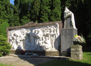 Národná kultúrna pamiatka vyhlásená v roku 1963. Pamätník sa nachádza na mestskom cintoríne. Postavený bol na severnej strane centra mesta v 20.rokoch 20.storočia. Na zadnej strane sú figurálne zobrazené výjavy z 1.svetovej vojny, zhotovené zo zbierok Handlovčanov. Predná strana je venovaná pamiatke obetí 2.svetovej vojny. Autorom je Martin Prôčka. Obe strany pamätníka boli odhalené po zriadení mestského cintorína, pričom z pôvodného umiestnenia na námestí bol preložený v roku 1956. Pomník s reliéfmi je venovaný aj štrajku v roku 1918. Opravený bol v rokoch 1945 a 1967. (zdroj: www.krizom-krazom.eu)