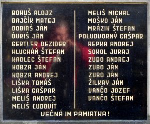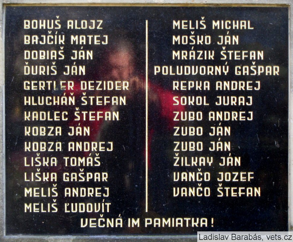 BOHUŠ ALOJZ, BAJČÍK MATEJ, DOBIÁŠ JÁN, ĎURIŠ JÁN, GERTLER DEZIDER, HLUCHÁŇ ŠTEFAN, KADLEC ŠTEFAN, KOBZA JÁN, KOBZA ANDREJ, LIŠKA TOMÁŠ, LIŠKA GAŠPAR, MELIŠ ANDREJ, MELIŠ ĽUDOVÍT, MELIŠ MICHAL, MOŠKO JÁN, MRÁZIK ŠTEFAN, POLUDVORNÝ GAŠPAR, REPKA ANDREJ, SOKOL JURAJ, ZUBO ANDREJ, ZUBO JÁN, ZUBO JÁN, ŽILKAY JÁN, VANČO JOZEF, VANČO ŠTEFAN