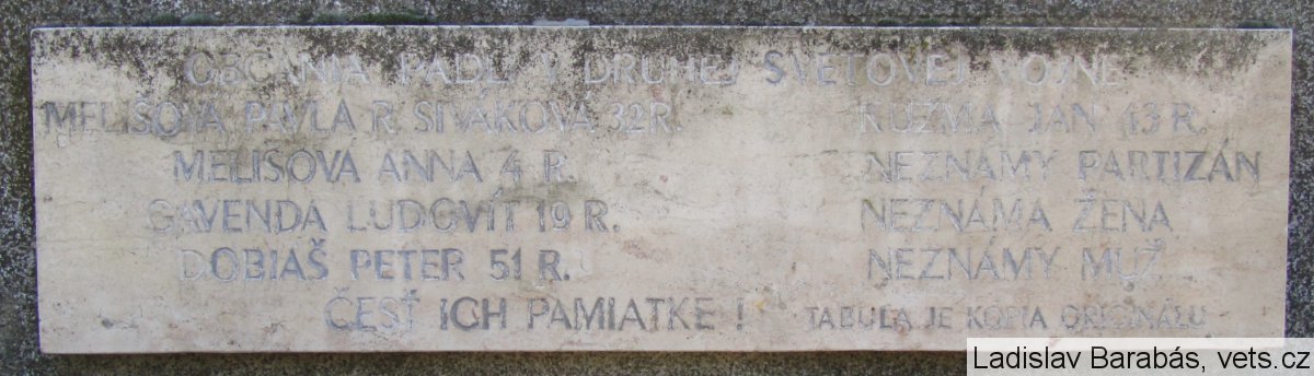 MELIŠOVÁ PAVLA R. SIVÁKOVÁ 32 R., MELIŠOVÁ ANNA 4 R., GAVENDA ĽUDOVÍT 19 R., DOBIÁŠ PETER 51 R., KUZMA JÁN 13 R., NEZNÁMY PARTIZÁN, NEZNÁMA ŽENA, NEZNÁMY MUŽ