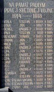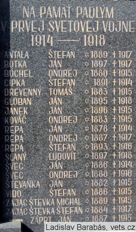 ANTALA ŠTEFAN *1889 †1917, BOTKA JÁN *1897 †1917, BÚCHEL ONDREJ *1880 †1915, CIPKA ŠTEFAN *1891 †1914, DREVENNÝ TOMÁŠ *1883 †1915, GLOBAN JÁN *1895 †1918, JANEK JÁN *1896 †1915, KOVÁČ ONDREJ *1883 †1915, REPA JÁN *1878 †1914, REPA ONDREJ *1887 †1917, REPA ŠTEFAN *1893 †1916, SLANÝ ĽUDOVÍT *1897 †1918, ŠVEC JÁN *1886 †1914, ŠVEC ONDREJ *1888 †1916, ŠTEVANKA JÁN *1882 †1915, VIDO ŠTEFAN *1886 †1915, ZAJÁC ŠTEVKA MICHAL *1889 †1915, ZAJÁC ŠTEVKA ŠTEFAN *1884 †1917,ZÁPRT JÁN *1887 †1915