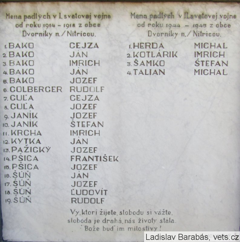 1.BAKO GEJZA, 2. BAKO JÁN, 3. BAKO IMRICH, 4. BAKO JÁN, 5. BAKO JOZEF, 6. GOLBERGER RUDOLF, 7. GUĽA GEJZA, 8. GUĽA JOZEF, 9. JANÍK JOZEF, 10. JANÍK ŠTEFAN, 11. KRCHA IMRICH, 12. KYTKA JÁN, 13. PAŽICKÝ JOZEF, 14. PŠICA FRANTIŠEK, 15. PŠICA JOZEF, 16. ŠÚŇ JÁN, 17. ŠÚŇ JOZEF, 18. ŠÚŇ ĽUDOVÍT, 19. ŠÚŇ RUDOLF
