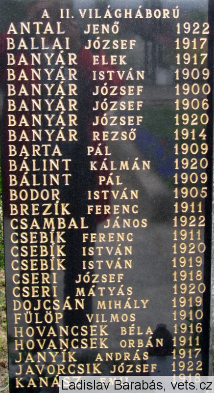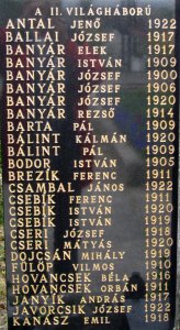 ANTAL JENŐ 1922, BALLAI JÓZSEF 1917, BANYÁR ELEK 1917, BANYÁR ISTVÁN 1909, BANYÁR JÓZSEF 1900, BANYÁR JÓZSEF 1906, BANYÁR JÓZSEF 1920, BANYÁR REZSŐ 1914, BARTA PÁL 1909, BÁLINT KÁLMÁN 1920, BÁLINT PÁL 1909, BODOR ISTVÁN 1905, BREZÍK FERENC 1911, CSAMBAL JÁNOS 1922, CSEBÍK FERENC 1911, CSEBÍK ISTVÁN 1920, CSEBÍK ISTVÁN 1919, CSERI JÓZSEF 1918, CSERI MÁTYÁS 1920, DOJCSÁN MIHÁLY 1919, FÜLÖP VILMOS 1910, HOVANCSEK ORBÁN 1911, JANYÍK ANDRÁS 1917, JAVORCSIK JÓZSEF 1922, KANÁSZ EMIL 1918