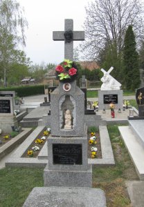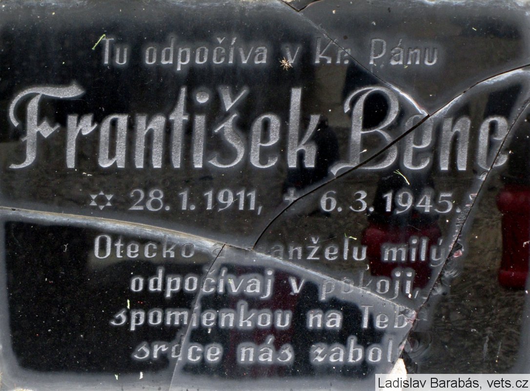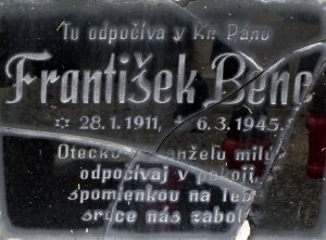 Nápis na náhrobníku je rozbitý. Vedľa sú dva náhrobníky padlých v II. svetovej vojne, ktoré majú nápisy rozbité na drobné črepy.