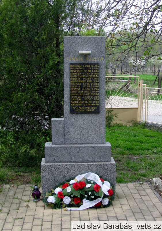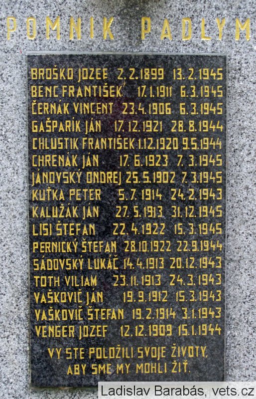 BROŠKO JOZEF 2.2.1899 13.2.1945, BENC FRANTIŠEK 17.1.1911 6.3.1945, ČERNÁK VINCENT 23.4.1906 6.3.1945, GAŠPARÍK JÁN 17.12.1921 28.8.1944, CHLUSTIK FRANTIŠEK 1.12.1920 3.5.1944, CHRENEK JÁN 17.6.1923 7.3.1945, JÁNOVSKÝ ONDREJ 25.5.1902 7.3.1945, KUŤKA PETER 5..1914, 24.2.1943, KALUŽÁK JÁN 27.5.1913 31.12.1945, LISI ŠTEFAN 22.4.1922 15.3.1945, PERNICKÝ ŠTEFAN 28.10.1922 22.9.1944, SÁDOVSKÝ LUKÁČ 14.4.1913 20.12.1943, TOTH VILIAM 23.11.1913 24.3.1943, VAŠKOVIČ JÁN 19.9.1912 15.3.1943, VAŠKOVIČ ŠTEFAN 19.2.1914 3.1.943, VENGER JOZEF 12.12.1909 15.1.1944