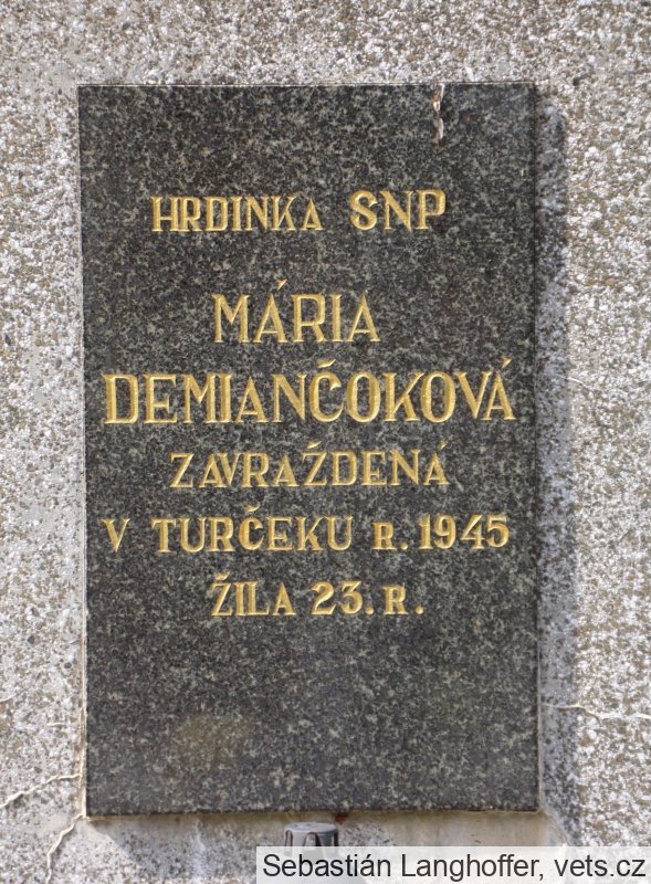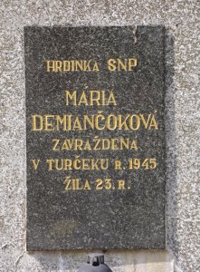 Mária Demiančoková sa narodila 30.10.1922. V čase úmrtia bola príslušníčkou ozbrojených síl - odbojovej skupiny Sitno. Zajatá bola počas incidentu pri Počuvadlianskom mlyne 23.11.1944, kedy nemecká strana likvidovala základňu odbojovej skupiny v mlyne. Časti odbojárov sa z obkľúčeného mlyna podarilo uniknúť, časť z nich padla do nemeckého zajatia. Zajatí odbojári boli neskôr popravení v Turčeku a Kremničke. Mária Demiančoková zahynula v januári 1945 v Turčeku pri Martine.